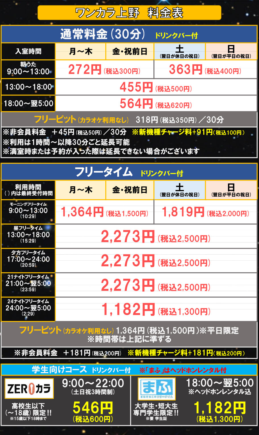 ※価格は全て税込料金です ※ヘッドホン持込可 ※日付の変更は、翌朝5時です ※全時間ドリンクバー無料。 ※最初のご利用は1時間より承ります ※料金は予告なしに変更する場合がございます、ご了承ください ※会員カードお忘れの場合はアプリ登録への切り替えになります ※カード会員登録の場合、発行手数料として300円頂戴いたします(アプリ会員登録なら無料!!) ※朝うたご利用の場合、ヘッドホンレンタル料金300引!!